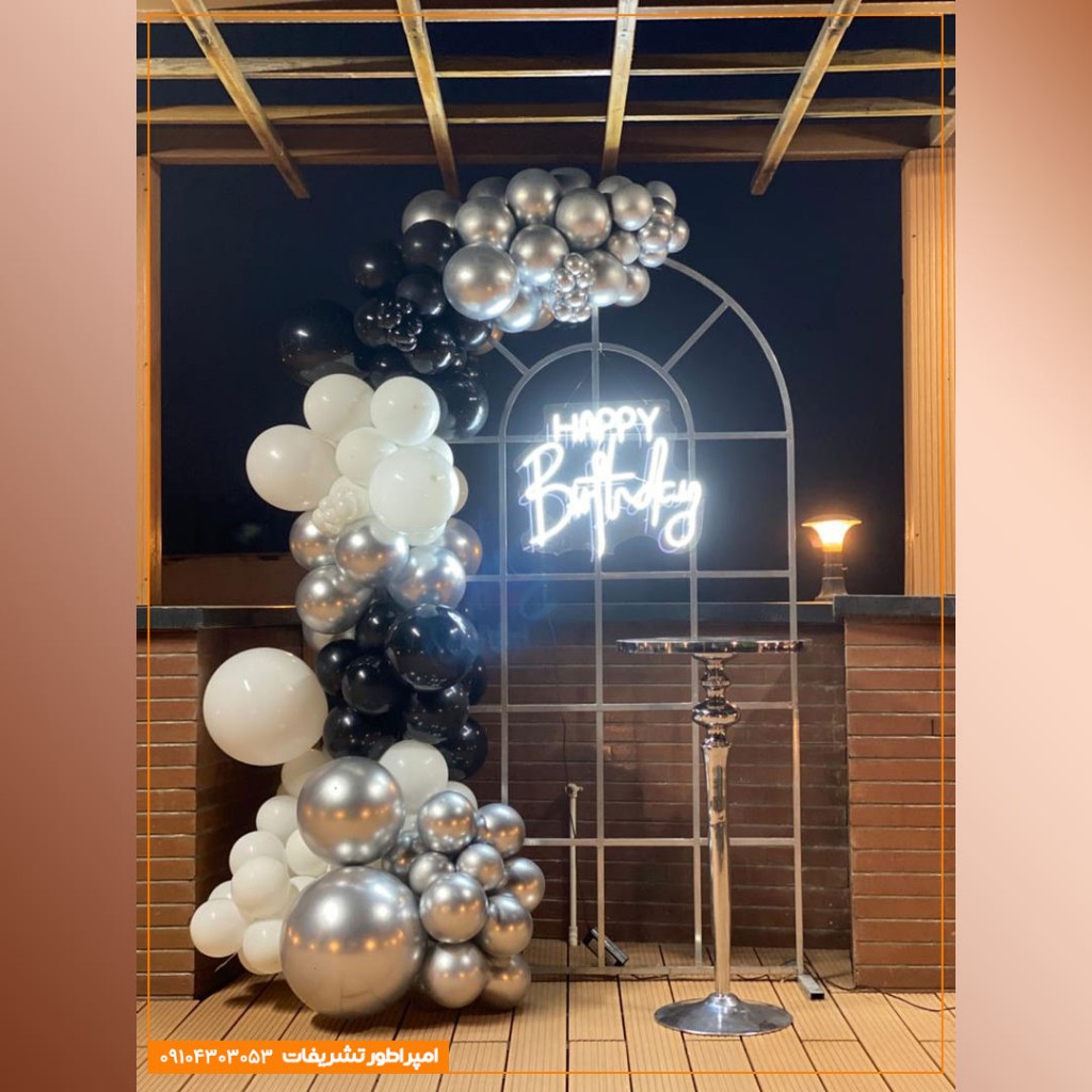بادکنک آرایی مراسم تولد با تم بادکنکهای سفید، نقرهای و مشکی و نئون