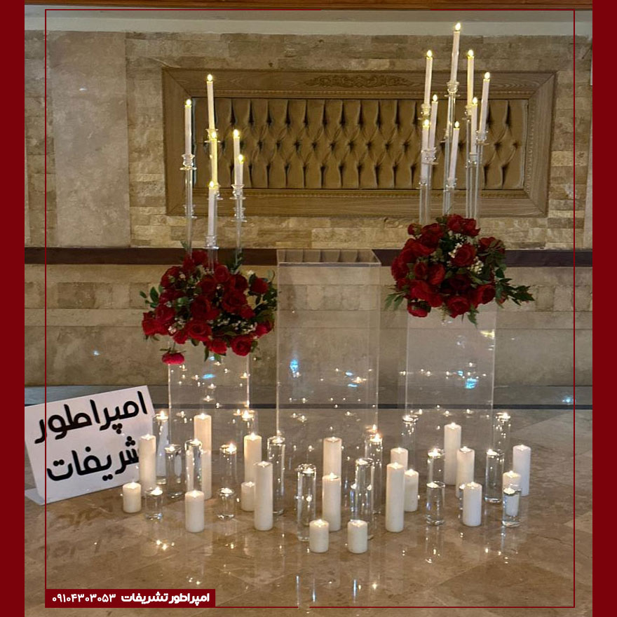 دکور مراسم گلآرایی سرخِ آتشین با شمعهای سفیدِ خالص