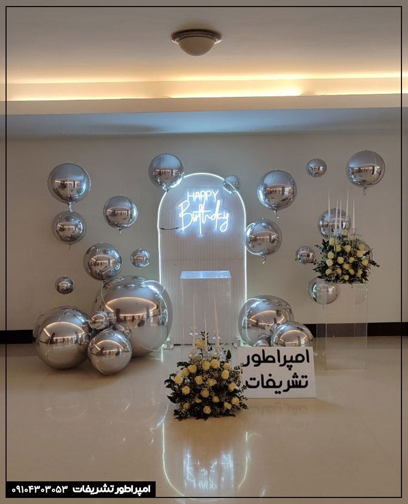 بادکنکهای رنگی: چند بادکنک هلیومی در رنگهای شاد (مثل آبی، قرمز یا طلایی) را به میز یا گوشهای از اتاق ببندید. میتوانید از بادکنکهای عدد برای نمایش سن متولد استفاده کنید.